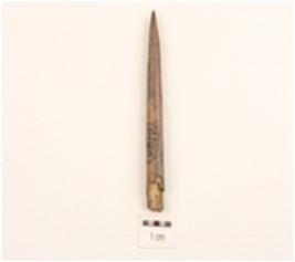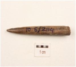 | Description / विवरण | Bone point, proximal end broken, sharp pointed end, smooth and polished surface round section. |