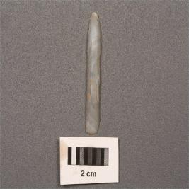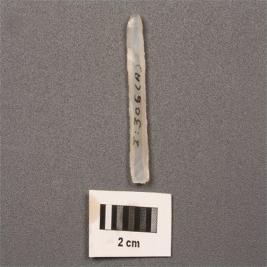 | Description / विवरण | Parallel blade on chalcedony with mid ridge on dorsal side and prominent bulb on ventral side along proximal end, use wear marks on both edges. |
