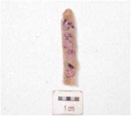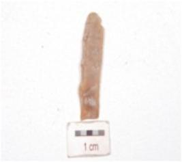 | Description / विवरण | Fragment of a parallel sided blade, made on chert, prepared platform broken distal end,prominent bulb on ventral side, regular retouches along one lateral side on dorsal surface and use-wear marks along cutting edges. |