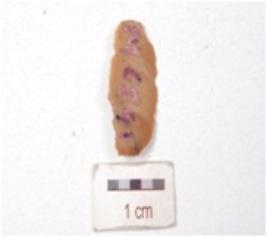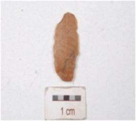 | Description / विवरण | Fragment of a parallel sided blade, made on chert, prepared platform on proximal end, partly broken distal end, diffused bulb on ventral side, ridge on dorsal side and use-wear marks along the cutting edges. |