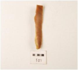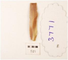 | Description / विवरण | A chert blade made on end struck flake, flake scars on the surface, prominent bulb on the ventral side, and prepared platform on the proximal end retouching on the cutting edges. |