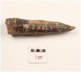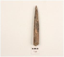| Description / विवरण | Bone point, proximal end broken, sharp pointed end, polished surface, oval cross section. |