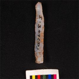 | Description / विवरण | Parallel sided blade, made on chalcedony surface, two ridge on dorsal surface, ventral surface is smooth with prominent bulb at proximal end, use wear marks on edge. |