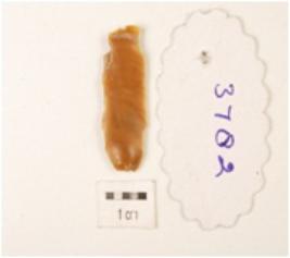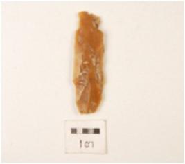 | Description / विवरण | A chert blade made on end struck flake, flake scars on the surface, prominent bulb on the ventral side, prepared platform on the proximal end and distal end intact, partly retouching on cutting edge. |