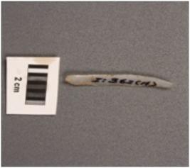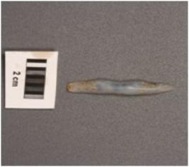 | Description / विवरण | Pen knife on chalcedony with mid ridge on dorsal side and defused bulb on ventral side along with proximal end, regular retouching marks on edge. Distal end is sharp. |