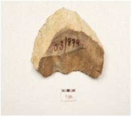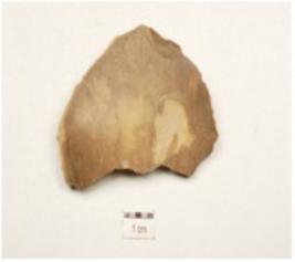 | Description / विवरण | A utilized flake made of chert, prominent bulb on ventral cortex is intact, irregular retouches along the working edge and flake scars on surface. |