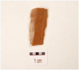 | Description / विवरण | Fragment of blade, made on chert with double ridge on dorsal side, use wear marks on cutting edge and trapezoid in section. |