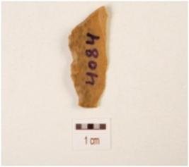 | Description / विवरण | Fragment of chert blade with prominent mid-ridge on dorsal side, use wear marks on cutting edge and triangular in section. |