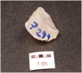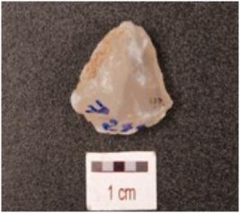 | Description / विवरण | Fragment of a side scraper, made of chalcedony core, straight, sharp cutting edge with retouches and use-wear marks. |
