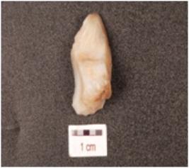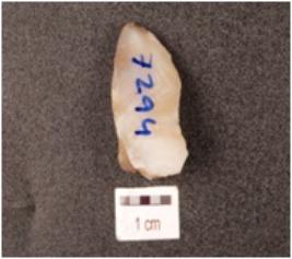 | Description / विवरण | An utilized flake on core made of chalcedony prominent bulb on ventral side and blade scars on dorsal side. |