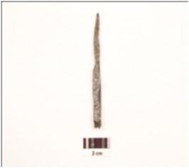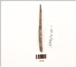 | Description / विवरण | Fragment of iron nail with broken head and pointed working end, chemically treated object, square in section. |