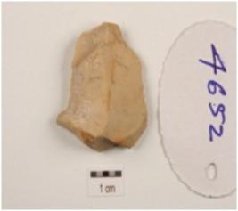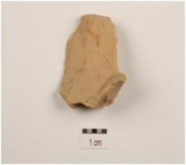 | Description / विवरण | Side scraper made on end struck chert flake, prepared platform, single ridge on dorsal surface, diffused bulb at ventral side, visible used wear marks. |