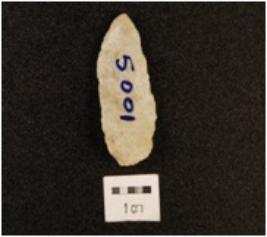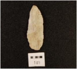| Description / विवरण | A blade made on chert with improminent double ridge on dorsal side, bulb on ventral side, use-wear marks on cutting edge and trapezoidal in section. |