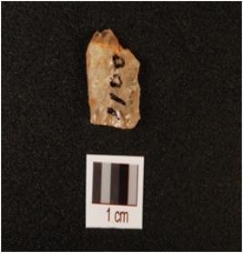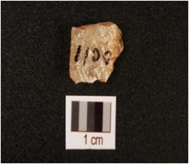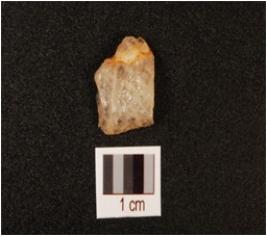 | Description / विवरण | A quartz flake with partly intact cortex and two flake scars on surface. |