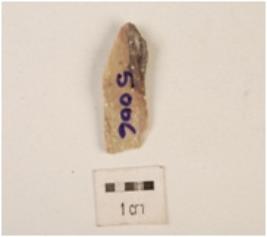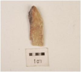 | Description / विवरण | A blade made on chert with prominent mid-ridge on dorsal side, broken along distal end, diffused bulb on ventral side, use-wear marks on cutting edge and triangular in section. |