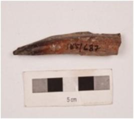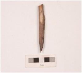 | Description / विवरण | A broken piece of bone point, surface having two groove one end is broken and other end is pointed. |
