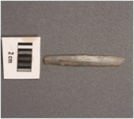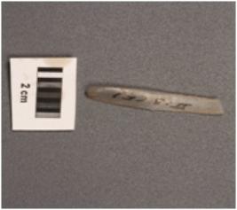 | Description / विवरण | Parallel sided blade, use wear marks on both working edges, prominent bulb at proximal end, distal end is broken vertical ridge on dorsal surface, straight ventral surface. |