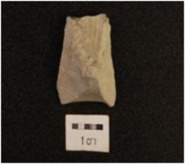 | Description / विवरण | A blade made on chert with double ridge on dorsal side, use-wear marks on cutting edge, trapezoidal in section and broken along distal end. |