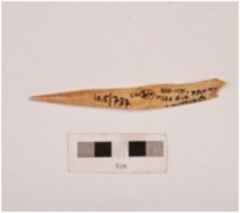 | Description / विवरण | A bone point, one end is broken and flat, another end is pointed, surface is smooth and polished white in colour. |