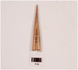 | Description / विवरण | A bone point, one end pointed and other is flat and broken, surface is smooth and polished, cracks and natural depression on surface. |