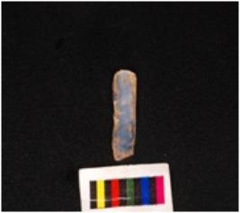 | Description / विवरण | Parallel sided blade with double ridge on dorsal surface, broken proximal end, intact distal end, use-wear marks along the cutting edge. |