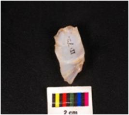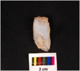 | Description / विवरण | Fragment of a chalcedony core with three blade scars on the surface. |
