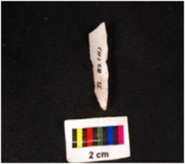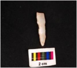 | Description / विवरण | A chalcedony blade with blunted left edge on dorsal side and use-wear marks along the right cutting edge, triangular section, diffuse bulb on ventral side and distal end broken. |
