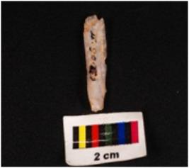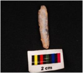 | Description / विवरण | A parallel sided blade made on chalcedony with a mid-ridge on the dorsal side, prominent bulb on the ventral side, irregular retouch on the cutting edges, chipped off ventral side. |