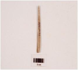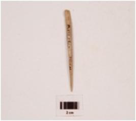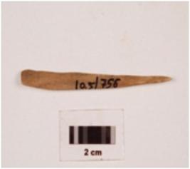 | Description / विवरण | A bone point, flat surface, one end is pointed and another end is broken, smooth surface and polished. |