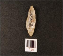 | Description / विवरण | A rock crystal scraper with use wear marks on working edge, smooth surface and flake scars on dorsal side. |