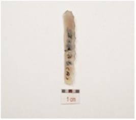 | Description / विवरण | A blade made of chalcedony, ridges scars on dorsal broken both ends and use wear marks along cutting edge. |