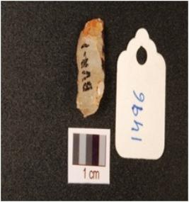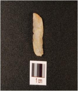 | Description / विवरण | A quartz side scraper with use wear marks on working edge, flake scars on dorsal and smooth surface. |