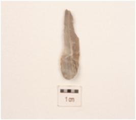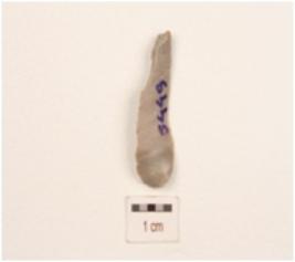| Description / विवरण | A flake made on chert, mid ridge on dorsal side and diffused bulb on ventral side, use wear marks on edges. |