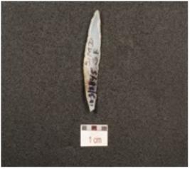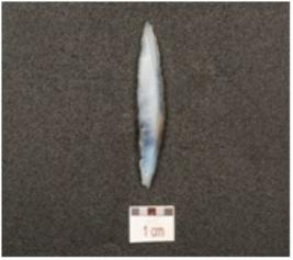 | Description / विवरण | A blade made of chalcedony, mid ridge on dorsal pointed distal end and use wear marks along cutting edge. |
