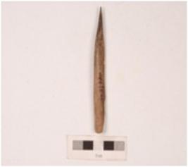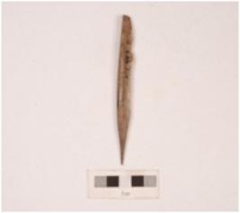 | Description / विवरण | Fragment of pointed arrow head bone, plano convex in section, smooth surface, polished both sides, heated bone in fire. |