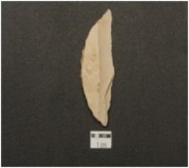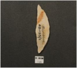 | Description / विवरण | Lunate made of chert, a ridge on dorsal surface, retouched cutting edge with wear marks. |