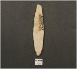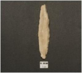 | Description / विवरण | Backed blade made on end struck flake, a prominent ridge on dorsal surface, backing on one side and wear marks on other side. |