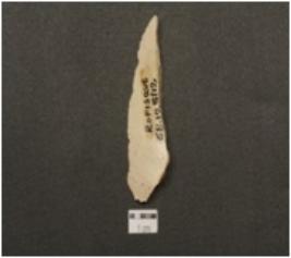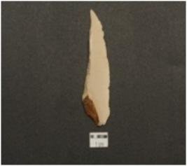 | Description / विवरण | Penknife chert blade, pointed distal end, backing on one side and wear marks on other side. |