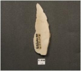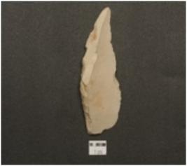 | Description / विवरण | Penknife chert blade, pointed distal end, backing on one side , wear marks on other side and cortex retained a little. |