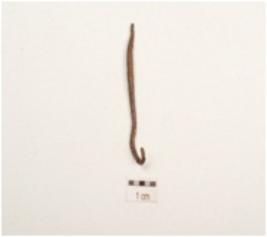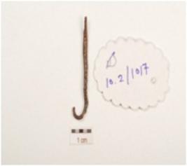 | Description / विवरण | Copper fragment of hook, smooth surface curved at one end, circular in section and chemically treated. |