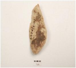 | Description / विवरण | Blade made of chert with cortex, mid ridge and ripple marks on dorsal, bulb on ventral, triangular in section and prepared platform, pointed along distal end and use wear marks along cutting edges. |