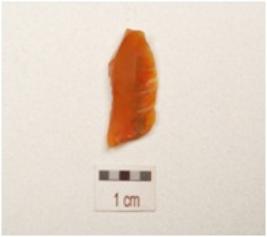 | Description / विवरण | Blade made of chalcedony with double ridge on dorsal, bulb on ventral trapezoidal section and use wear marks on cutting edge, broken along distal end and raw material given heat treatment. |
