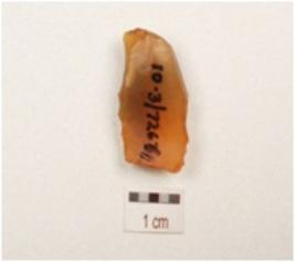 | Description / विवरण | Blade made of chalcedony with double ridge on dorsal, trapezoidal section, striking platform, slightly chipped off diffused bulb on ventral and use wear marks on cutting edge. |