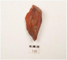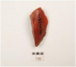 | Description / विवरण | A end struck flake made on carnelian with prepared platform, diffused bulb on ventral triangular in section and use wear marks on edge. |