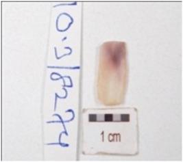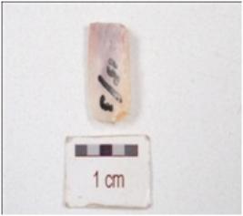 | Description / विवरण | Fragment of a blade made on chert stone, surface is smooth, double ridge on dorsal side and wear marks on cutting edge. |
