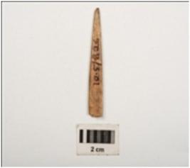 | Description / विवरण | A bone point mde on a bone, smoothly polished surface upper and lower side, one part pointed. |