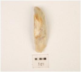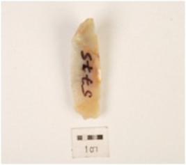 | Description / विवरण | A utilized flake made on chert, flake scars on dorsal side surface, pointed on one end, platform and bulb absent, triangular in section, use wear marks along cutting edge. |