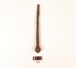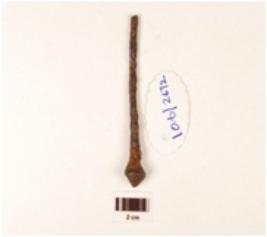 | Description / विवरण | Iron nail, pointed end broken, head portion round, circular cross section, corroded surface. |