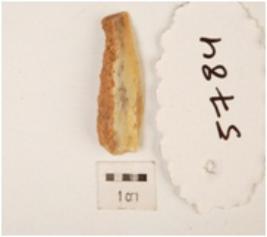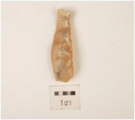| Description / विवरण | A flake made on chert, flake scars on dorsal side surface, cortex on one side surface, use wear marks along cutting edge, triangular in section. |