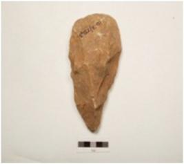 | Description / विवरण | A handaxe made of quartzite, end struck flake, bulb absent, round butt end, pointed other end, cortex on butt end, wavy cutting edge, flake scars on both surfaces, plain convex in section. |